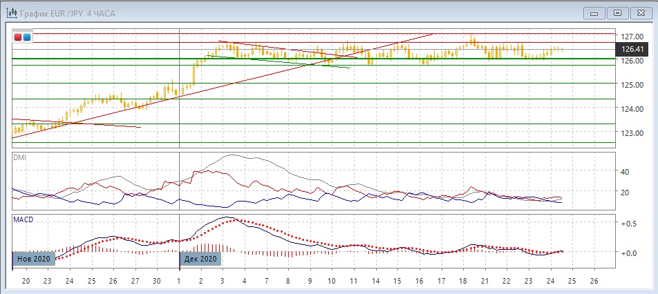 На дневном графике пара остаётся в диапазоне декабря, уровень 126,00 не был преодолён, и отскок скорее приведёт к верхней границе канала 125,75-126,70. Отсутствие развития снижения может быть бычьим признаком, так как ранее был ложный пробой вверх, что повышало вероятность выхода из диапазона вниз (чего не произошло). По индикаторам направленного движения коррекция к росту: превышение DM+ над DM- остаётся большим при высоком уровне ADX, коррекция видна по снижению гистограммы MAACD и небольшому отрицательному наклону линии MACD.