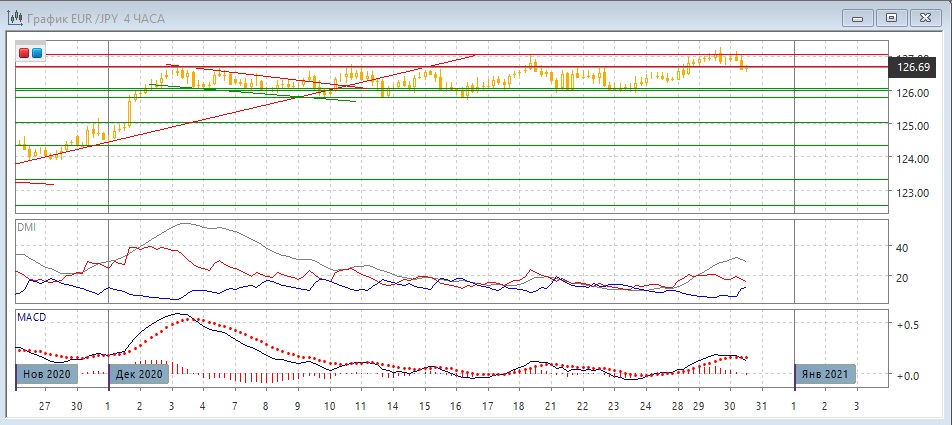 На четырёхчасовом графике видно, как тестировался уровень 127,00 (у максимумов августа и декабря), после чего пара вышла из узкой консолидации ниже 127,00 ниже, и вернулась в диапазон декабря 125,75-126,70. Пока попытка выхода вверх кажется ложным пробоем, хотя по времени он немного затянулся. В диапазоне более вероятным видится снижение к нижней границе, так как выход вверх не был поддержан. Преодоление уровня верхней границы диапазона 126,70 также стало и преодолением предыдущего относительного минимума, таким образом, относительные максимумы и минимуму в этом масштабе уже снижаются. Это признак перехода к снижению.
