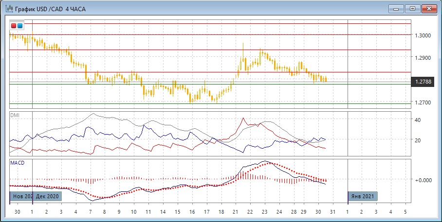 На четырёхчасовом графике пара продолжает последовательное снижение, уровень 1,2830 выступил во вторник уже сопротивлением при отскоке вверх от уровня 1,2775. Пара вновь приблизилась к поддержке на 1,2775, и пока более вероятно, что снижение в краткосрочной перспективе будет продолжаться. Исходя из размера канала 21-28 декабря в 100 пунктов, целью измеренного движения является 1,2730, что было бы преодолением уровня 1,2775 и сделало следующей целью минимумы ноября у 1,2690.