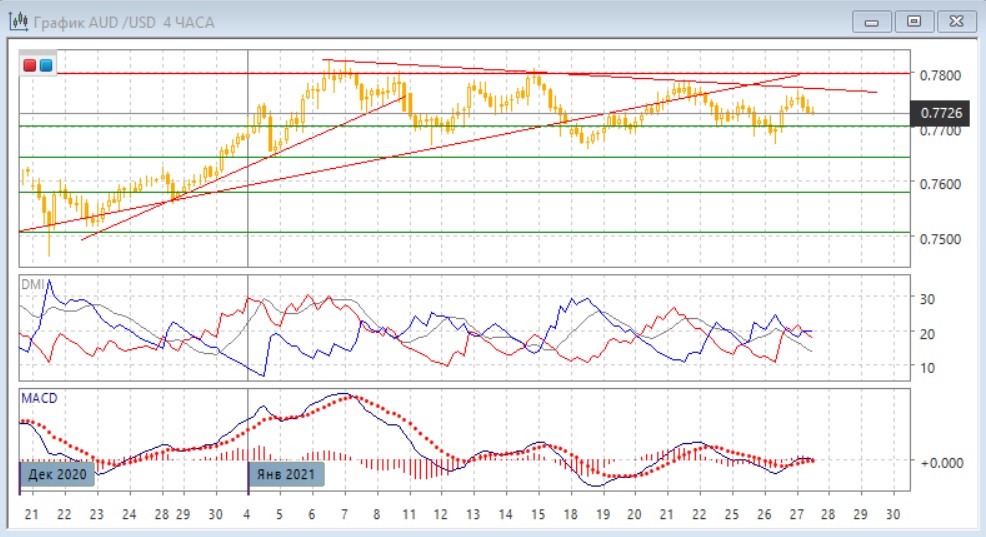На четырёхчасовом графике образовалась вершина, и пара, вероятно, будет возвращаться к минимумам 18 и 26 января (сейчас идёт волна снижения после волны роста 26 января). В более широкой перспективе продолжается движение в диапазоне. По индикаторам направленного движения флэт: DM+ и DM- пересекаются, ADX на низком уровне, гистограмма MACD колеблется около нуля, линия MACD меняет направление. Так как хорошо выраженного направленного движения нет, поддержку пара может получить раньше - на ближайшем "круглом" уровне 0,7700.