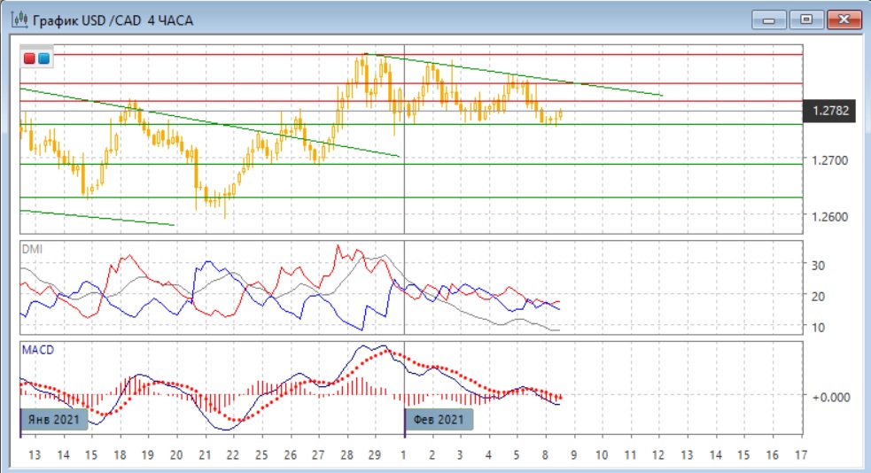 На четырёхчасовом графике образуется треугольник из линии поддержки на 1,2760 и нисходящей линии тренда с конца января. Если пара останется в треугольнике, может быть отскок до 1,2830 (сопротивление там будет укрепляться линией тренда). Еще более выражено, чем в дневном масштабе, по индикаторам направленного движения тенденция отсутствует: DM- и DM+ пересекаются, уровень ADX очень низкий, гистограмма MACD колеблется около нуля. Сигналом выхода из треугольника было бы преодоление уровня 1,2760, тогда может ожидать существенного снижения до следующей сильной поддержки на 1,2690.