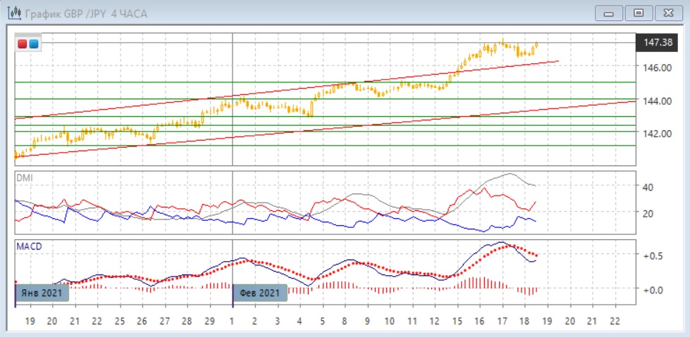 На четырёхчасовом графике тенденция откат завершился ещё до верхней границы восходящего канала, после образования нескольких свечей "дожи" пара почти достигла максимума 16-17 февраля. Продолжение роста остаётся предпочтительным. По индикаторам направленного движения в этом масштабе коррекция к росту: DM+ остаётся выше DM-, ADX на высоком уровне, коррекция видна по развороту линии MACD и снижению гистограммы MACD до 18 февраля, однако сейчас она снова приближается в положительной зоне. Сопротивление около предыдущего максимума может быть усилено образованием медвежьего расхождения максимумов пары и гистограммы MACD.