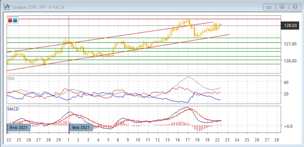 На дневном графике пара восстановилась от уровня поддержки 127,30, и на близилась к последнему максимуму. Последовательность роста относительных минимумов сохраняется, пара остаётся выше линии тренда. Выше сопротивление на максимуме среды 17 февраля будет примерно соответствовать сопротивлению на верхней границе канала, что усиливает сопротивление. Открытие с разрывом ниже может быть медвежьим признаком. По индикаторам направленного движения тенденцией является рост: превышение DM+ над DM- остаётся большим, уровень ADX растёт, линия MACD имеет положительный наклон, гистограмма MACD остаётся в положительной зоне.