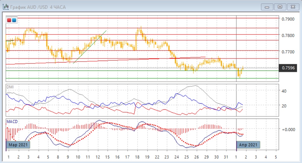 На четырёхчасовом графике можно предположить ложный пробой уровня поддержки 0,7580. Пара вернулась в диапазон 0,7580-0,7650. Исходя из движения в диапазоне, возвращение к верхней границе на 07650 кажется более вероятным. До этого минимум не был подтверждён по гистограмме MACD. Это, скорее, укрепляет поддержку на 0,7580.