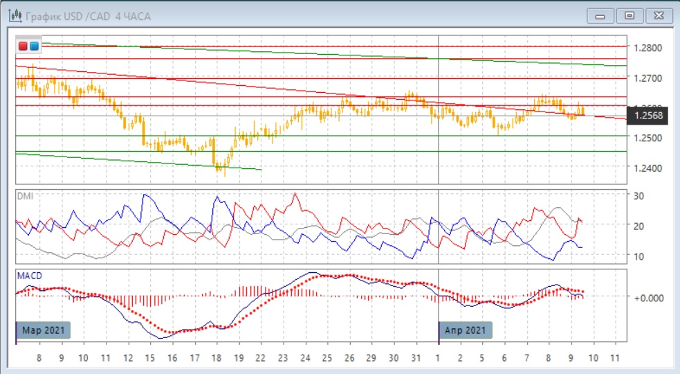 На четырёхчасовом графике пара снова снижается от сопротивления 1,2630. Сейчас она достигла линии нисходящего тренда в этом масштабе (и верней границы канала в дневном масштабе). Снижение ниже текущего уровня открывает дорогу к ближайшему "круглому" уровню 1,2500 - поддержка здесь может быть сильной, так как это психологически важный уровень, рядом с предыдущим минимумом апреля. Очередной откат пары от зоны сопротивления 1,2600-1,2630 также увеличивает вероятность более значительного снижения от этого уровня.