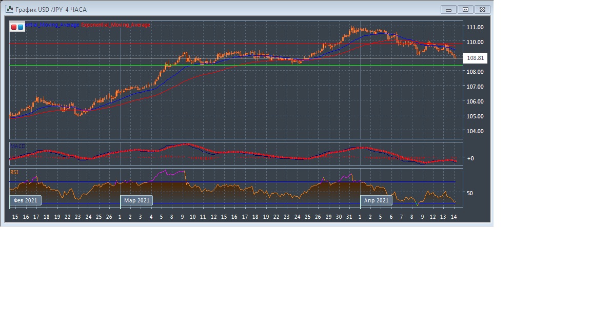 Скользящие средние с периодом 21 и 55 дней разворачиваются вниз, слегка увеличивая расхождение, что демонстрирует укрепление медведей в краткосрочной перспективе. Четырёхчасовой график прогрессирует ниже экспоненциальных скользящих средних, что тоже говорит о пока что сохраняющемся потенциале медведей в краткосрочной перспективе.