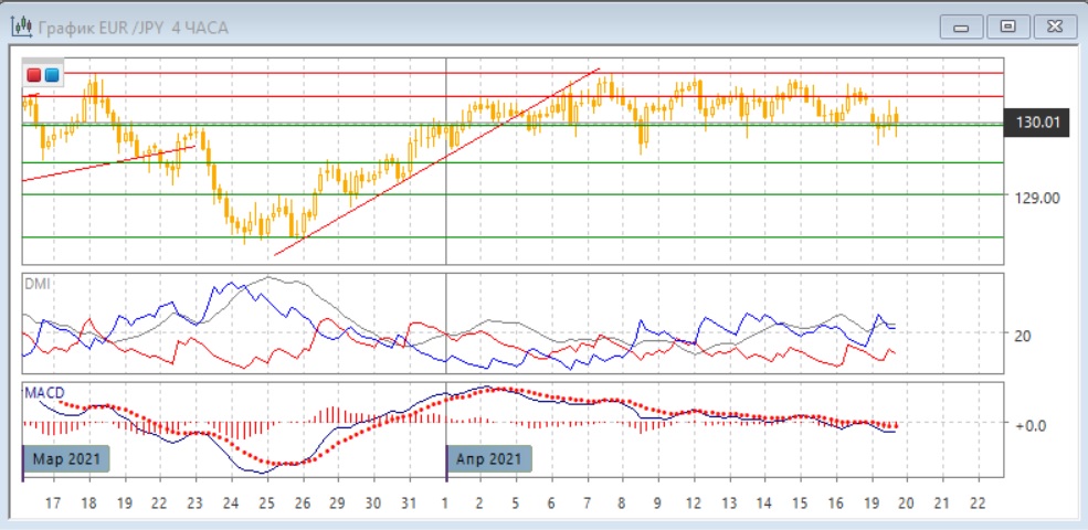 На дневном графике ситуация не изменилась: пара осталась в консолидации которую можно определить 130,00-130,70. Пребывание в узком диапазоне с начала апреля затягивается, при выходе движение может быть сильным в сторону выхода из диапазона, но нужно дождаться, когда это фактически произойдёт.