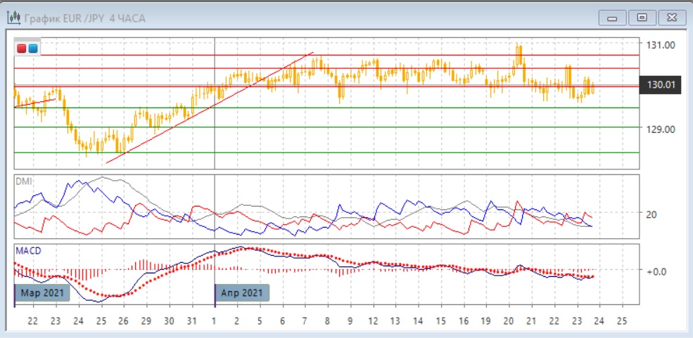 На четырёхчасовом графике пара вернулась ниже нижней границы канала 130,00-130,70. Постепенное снижение с 20 апреля продолжилось - относительные максимумы и минимумы сейчас снижаются. Закрепление пары ниже 130,00 облегчает дальнейшее движение. Уровень 130,00 выступает сейчас уже сопротивлением. Сейчас более вероятно, что снижение будет продолжаться.