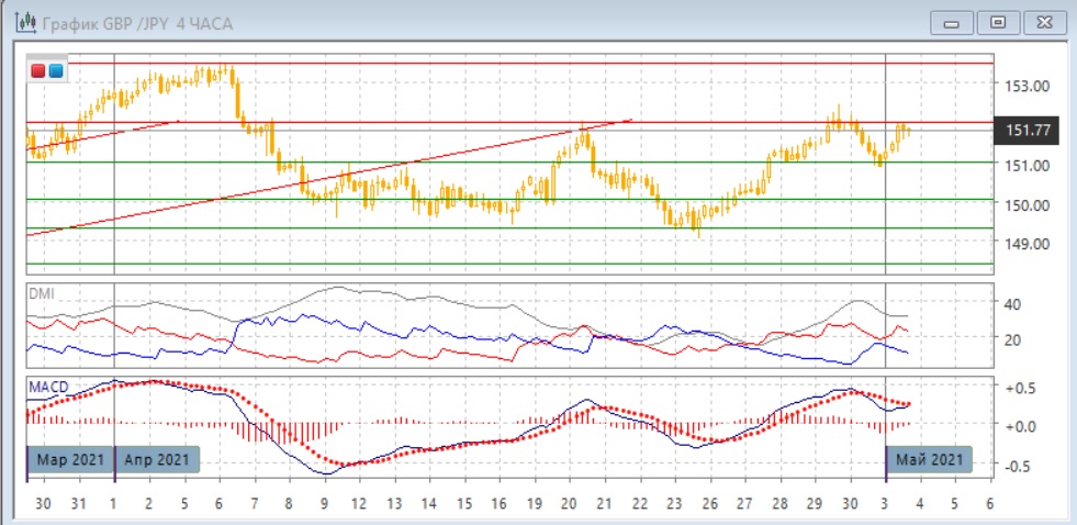 На четырёхчасовом графике пара получила поддержку на 151,00 и вновь вернулась с сопротивлению, от которого произошёл откат - 152,00. Вновь от этого уровня пара не снизилась, и это повышает вероятность преодоления уровня 152,00. Тем не менее, рассчитывать на рост стоит только после преодоления 152,00, так как тогда риск отката с небольшой потенциальной прибылью значительно уменьшился бы.