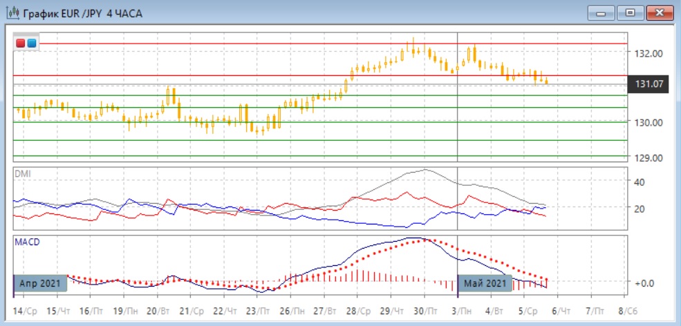 На четырёхчасовом графике пара преодолела уровень промежуточного минимума двойной вершины у 132,25, сейчас оно выступает уже сопротивлением. Исходя из этого, ближайшей целью является сильная поддержка на 130,70. Снижение замедляется, так как новые минимумы пары не подтверждаются новыми минимумами по MACD. Последовательность снижения относительных максимумов не нарушена. Сигналом возобновления роста может быть восстановление выше 131,30.
