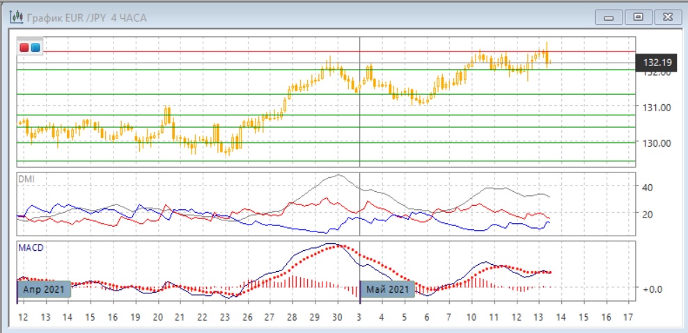 На четырёхчасовом графике тоже можно увидеть медвежье расхождение максимумов пары и гистограммы MACD. Пока пара не закрепилась выше предыдущих максимумов мая, потенциально может образоваться третья вершина около 132,50. С другой стороны, если рассматривать диапазон 10-13 мая как консолидацию после преодоления уровня 132,00, более вероятный выход из него вверх - продолжение тенденции. Краткосрочно пара, вероятно, будет двигаться в сторону отхода от уровня 132,00.