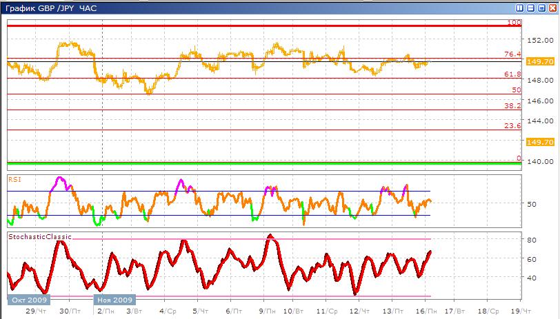 Торговля этой валютной пары находится также в валютном коридоре между 61,8% и 100% по Фибоначчи. Пока видимых сдвигов и намеков на прорыв канала не наблюдается. Скорее всего дальнейшее движение будет продолжено по схожему сценарию. По классическим индикаторам торговли они указывают на покупку данной пары, Stohastic после своего пересечения направляется в сторону зоны перекупленности, RSI также сейчас пересекает середину своего индикатора и направился в перекупленность. Скорее всего после достижения уровня в 76,4% будет разворот в обратную сторону.