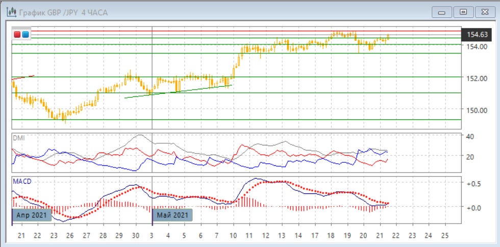 На четырёхчасовом графике пата тестирует верхнюю границу консолидации 153,50-154,45. Так как после отката от верхней границы, после образования разворотной комбинации с "падающей звездой", нижняя достигнута не была, и пара находится сейчас выше 154,45, пара может сейчас выйти из диапазона вверх. Исходы из размера диапазона, целью измеренного движения может быть 155,40. Однако совсем рядом находится сопротивление 18-19 мая на 154,90, дипазон может просто расшириться.