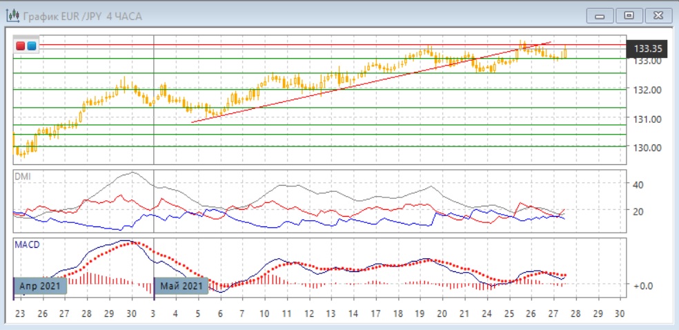На дневном графике пара протестировала сопротивление на предыдущем максимуме мая у 133,50, однако ниже этого уровня образовалась свеча с верхней тенью, что укрепляет сопротивление на этом уровне Пара осталась ниже линии восходящего тренда, если строить его с начала мая (он также не был преодолён). Образовалось медвежье расхождение максимумов пары и гистограммы MACD, что осложняет сейчас рост и увеличивает вероятность отката. Однако последовательность роста относительных максимумов и минимумов пары не нарушена, и по ADX тенденция роста сильная: превышение DM+ над DM- большое и устойчивое, при высоком уровне ADX. Сохранение тенденции может привести к новому тестированию уровня 133,50. То, что пара остаётся выше уровня 133,00, также является бычьим сигналом на данный момент.