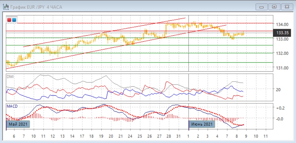 На четырёхчасовом графике отскок вверх от 133,00 приостановился ниже сопротивления на 133,50. Пара не вернулась к 133,00, таким образом тестирование уровня 133,50 всё же может состояться. В целом пока пара остаётся ниже 133,50, более вероятным видится возобновление снижения, так как с начала июня тенденция поменялась: теперь пара снижается, снижаются относительные максимумы и минимумы. По индикаторам направленного движения коррекция к снижению: DM- устойчиво выше DM+, ADX на относительно высоком уровне, коррекция видная по росту гистограммы MACD и развороту линии MACD.