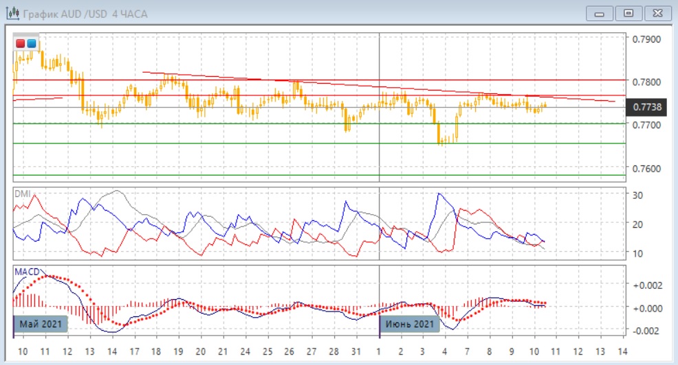 На четырёхчасовом графике пара снизилась от сочетания линии тренда по максимумам мая и уровня сопротивления на 0,7765. Если рассматривать ситуацию как очень вытянутый треугольник, пара может снизиться до нижней границы на 0,7700. Пока ложный пробой нижней границы (на 0,7700) 3-4 июня делает предпочтительным выход выше 0,7765, чем возвращение ниже 0,7700. По индикаторам направленного движения пара остаётся во флэте: DM+ и DM- близки, уровень ADX очень низкий, линия MACD примерно горизонтальна, гистограмма MACD остаётся около нуля.