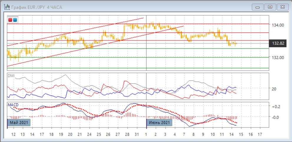 На дневном графике пара преодолела уровень поддержки 133,00 в пятницу, теперь на нём можно ожидать сопротивления при отскоке. Тенденция снижения с начала июня продолжается: относительные максимумы и минимумы снижаются. По индикаторам направленного движения тенденцией может стать снижение: DM+ и DM- близки к пересечению, гистограмма MACD снижается в отрицательной зоне, линия MACD имеет отрицательный наклон. Так как замедления снижения пока не видно, пара, вероятно, протестирует следующую и более сильную поддержку на 132,50.