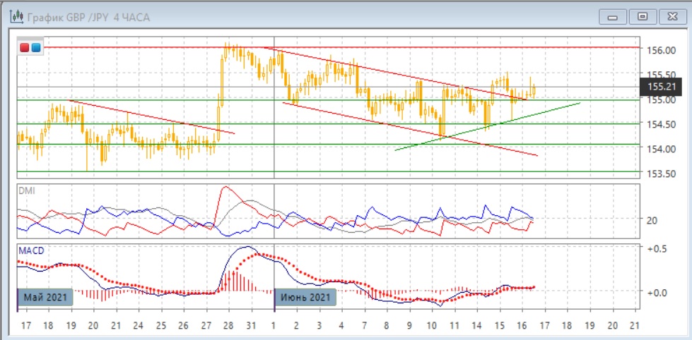 На четырёхчасовом график выход выше верхней границы нисходящего канала виден лучше. Сейчас верхняя граница канала и уровень 155,00 выступают поддержкой для пары, из-за их сочетания поддержка может укрепиться. С 10 июня пара постепенно растёт. Это может показывать потенциал дальнейшего роста, пока пара выше тренда по минимумам с 10 июня. По индикаторам направленного движения флэт: DM+ и DM- близки, гистограмма MACD около нулевого уровня, линия MACD почти горизонтальна.
