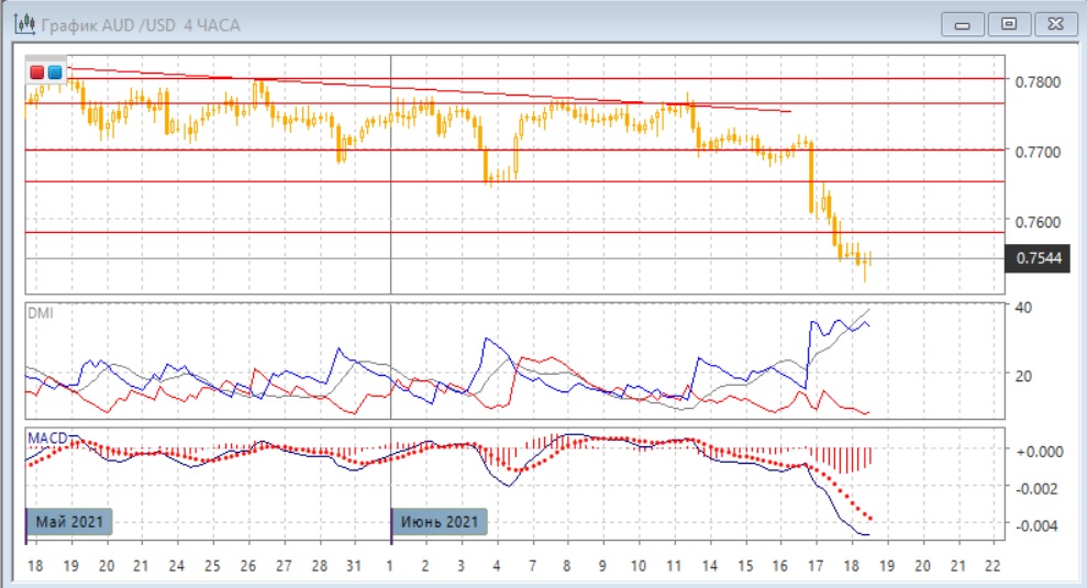 На дневном графике после резкого снижения пары было достигнуто закрытие в четверг ниже нижней границы более широкого канала с января 0,7580 (верхняя граница на 0,7800). Потенциально это открывает пространство для существенного дальнейшего снижения, если пара останется ниже уровня 0,7580. Легкость снижения, когда сходу были преодолены важные уровни поддержки, скорее является медвежьим сигналом на данный момент, так как показывают отсутствие серьёзной поддержки. По индикаторам направленного движения тенденция снижения усилилась: превышение DM- над DM+ очень большое, гистограмма MACD в отрицательной зоне, линия MACD имеет отрицательный наклон. При отскоке сопротивления можно ожидать на уровне 0,7580 и близко расположенном "круглом" уровне 0,7600. Восстановление выше этой зоны вернуло бы пару в канал с января.
