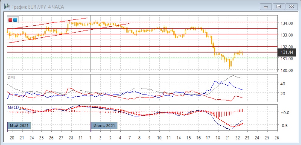 На четырёхчасовом графике дальнейшая краткосрочная перспектива, вероятно, будет зависеть от того, будет ли преодолён уровень 131,50 который пара тестирует после отскока вверх второй день, или от него произойдёт откат. Чем дольше уровень не преодолевается, тем более откат вероятен. По индикаторам направленного движения коррекция к снижению: DM- значительно выше DM+, уровень ADX высокий, коррекция видна по развороту линии MAСD и по росту гистограммы MACD.
