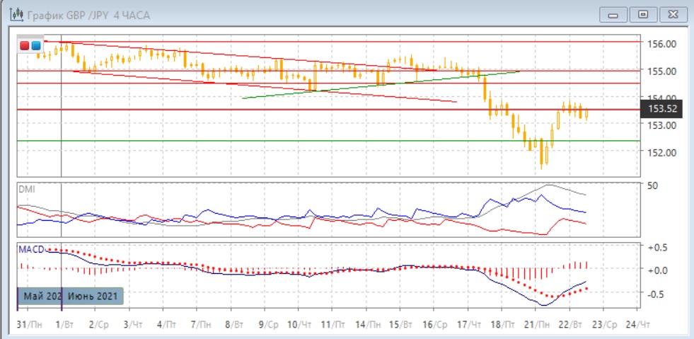 На дневном графике пара сильно восстановилась от уровня поддержки 152,35 (и 152,00). Пара вернулась к важному уровню 153,50 - поддержка в мае и относительный максимум конца марта - начала апреля. Если пара закрепится выше этого уровня, следующей целью может быть уровень 155,00 - важный уровень поддержки/сопротивления в мае и июне. Это также может сделать снижение к 152,00 сильным, но ложным пробоем уровня поддержки. Исходя из этого соображения, лучше подождать, будет ли уровень 153,50 преодолён или произойдёт откат. По индикаторам направленного движения тенденцией является снижение: DM- существенно выше DM+, гистограмма MACD в отрицательной зоне, линия MACD имеет отрицательный наклон.