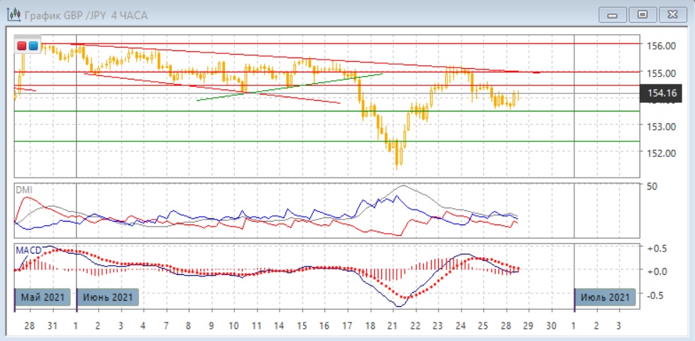 На дневном графике при откате от линии нисходящего тренда (построенного с конца мая) пара достигла важной поддержки на 153,50 - здесь находится поддержка в середине мая и максимум начала апреля. Последовательность снижения относительных максимумов и минимумов пары не была нарушена. Пока пара ниже сопротивления на линии тренда и уровне 155,00 более вероятным кажется снижение с возможной целью на 152,35 (максимумы середины марта, апреля и начала мая). По индикаторам направленного движения тенденцией является снижение: DM- устойчиво выше DM+, линия MACD имеет отрицательный наклон, гистограмма MACD находится в отрицательной зоне.