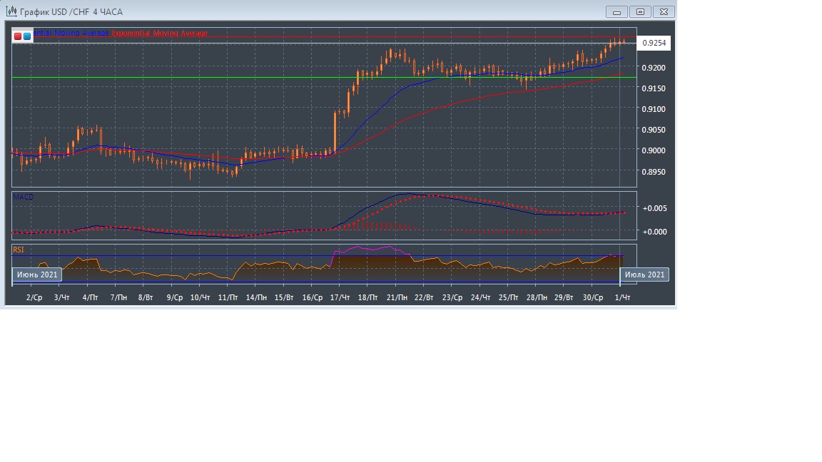 На четырёхчасовом графике скользящие средние с периодом 21 и 55 дней продолжают уверенное движение вверх, ускорились и теперь увеличивают расхождение, что говорит в пользу восходящего тренда на этом рынке. График котировок прогрессирует в области значительно выше экспоненциальных скользящих средних, что так же является признаком восходящего потенциала данного рынка в краткосрочной перспективе.