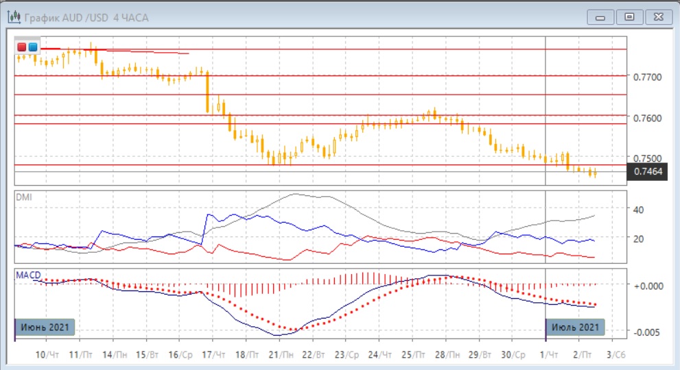 На четырёхчасовом графике пара остаётся не только ниже психологически важного уровня 0,7500, но и ниже минимумов 18-21 июня у 0,7480. Это сохраняет картину преодоления зоны поддержки и облегчает дальнейшее снижение, которое является предпочтительным, пока пара остаётся ниже 0,7500. По индикаторам направленного движения тенденцией является снижение: DM- устойчиво выше DM+, уровень ADX продолжает расти, линия MACD сохраняет отрицательный наклон, гистограмма MACD остаётся отрицательной зоне, хотя её повышение говорит о том, что снижение замедляется. Восстановление пары выше 0,7500 изменило бы картину.