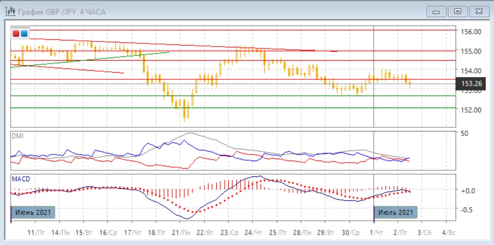 На дневном графике отскок от 152,65, кажется, завершается. Пара вернулась ниже уровня 153,50. В целом тенденция снижения с конца мая сохраняется. По индикаторам направленного движения тенденцией остаётся снижение: DM- значительно выше DM+, ADX на относительно высоком уровне, линия MACD имеет отрицательный наклон, гистограмма MACD находится в отрицательной зоне. Ближайшей целью является минимум конца июня у 152,65, скорее пара достигнет и поддержке на 152,00.