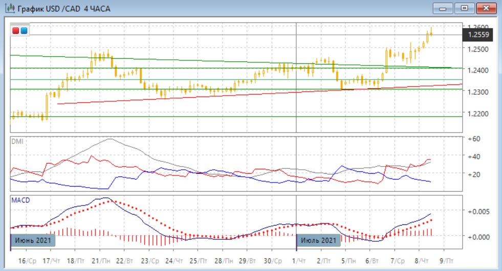 На четырёхчасовом графике рост стал хорошо выраженной тенденцией. По индикаторам направленного движения тенденция роста также сильная: превышение DM+ над DM- увеличилось, уровень ADX вырос. Гистограмма MACD в положительной зоне, линия MACD имеет положительный наклон. Происходит откат от следующего "круглого" уровня 1,2600. Он может продолжиться из-за большого размера движения от 1,2400, поддержки можно ожидать на психологически важном уровне 1,2500.