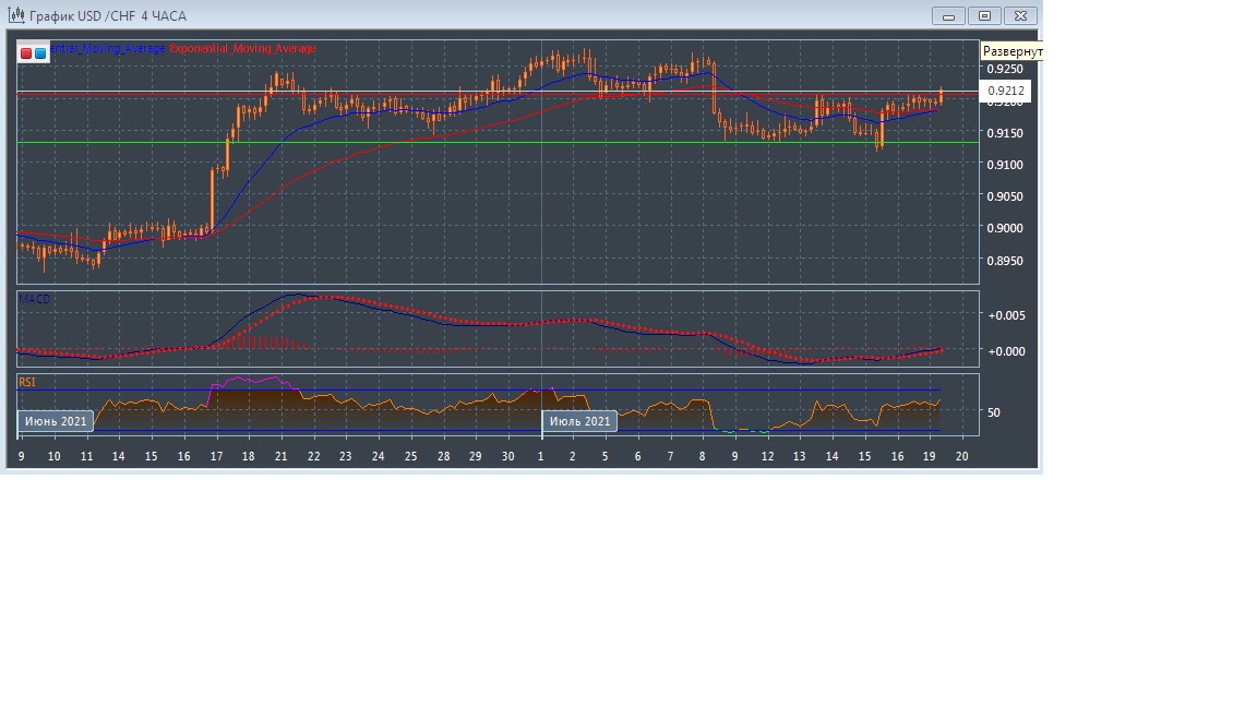 На четырёхчасовом графике скользящие средние с периодом 21 и 55 дней развернулись вверх, ускорились, увеличивая расхождение и формируют сигнал на покупку, что говорит нам о зарождении восходящего тренда на этом рынке. График котировок прогрессирует в области выше экспоненциальных скользящих средних, что является признаком восходящего потенциала данного рынка в краткосрочной перспективе.