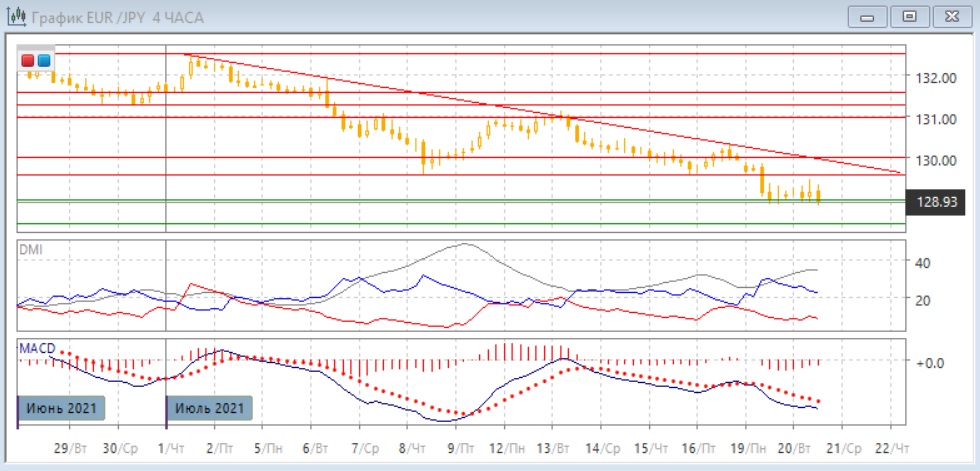 На дневном графике снижение продолжилось и в понедельник закрытие было ниже уровня 129,50 - ниже относительного минимума начала июня и минимумов апреля. Ниже поддержка видна только на 128,40 - у минимума марта. Преодоление уровня 129,60 облегчает дальнейшее снижение, так как теперь обоснованная поддержка вблизи отсутствует. Относительные максимумы и минимумы пары продолжают последовательно снижаться. По индикаторам направленного движения тенденция снижения сильная: превышение DM- над DM+ большое при высоком уровне ADX, линия MACD имеет отрицательный наклон, гистограмма MACD остаётся в отрицательной зоне.