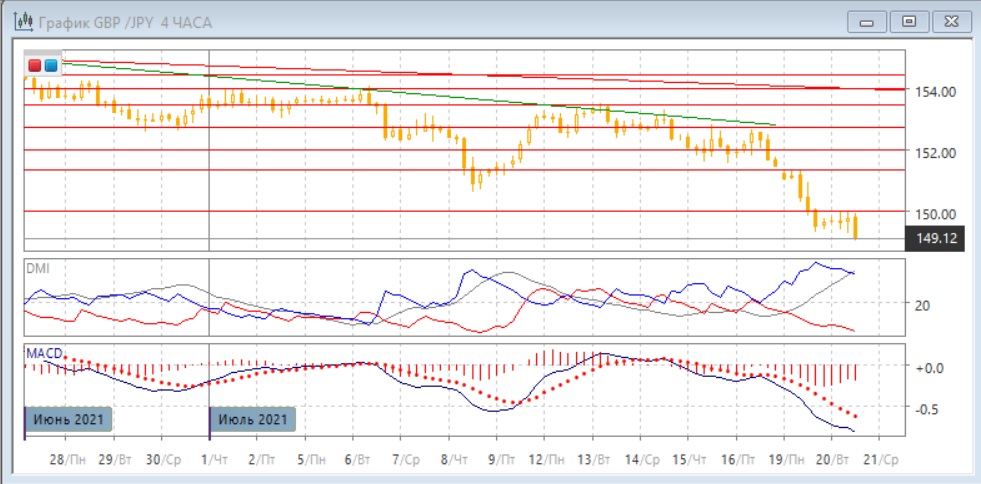 На дневном графике снижение продолжилось после преодоления уровня поддержки 151,35 образовалась широкодиапазонная свеча. Уровень 150,00 теперь можно рассматривать ближайшим сопротивлением. По индикаторам направленного движения снижение является сильной тенденцией: превышение DM- над DM+ очень большое, ADX на высоком уровне, гистограмма MACD в отрицательной зоне, линия MACD имеет отрицательный наклон. Идти против сильной тенденции не стоит, и импульс может продолжаться в ближайшей перспективе.