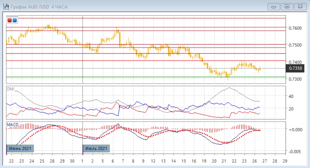 На четырёхчасовом графике произошёл откат от ближайшего "круглого" уровня 0,7400, но он приостановился. Может образоваться слабая разворотная комбинация. Снижение от 0,7400 было менее быстрым, чем рост от 0,7300 (угол наклона волны меньше). Это может быть медвежьим знаком, и если предполагать движение от 0,7300 из трёх волн, пара может вырасти до сопротивления на 0,7445.