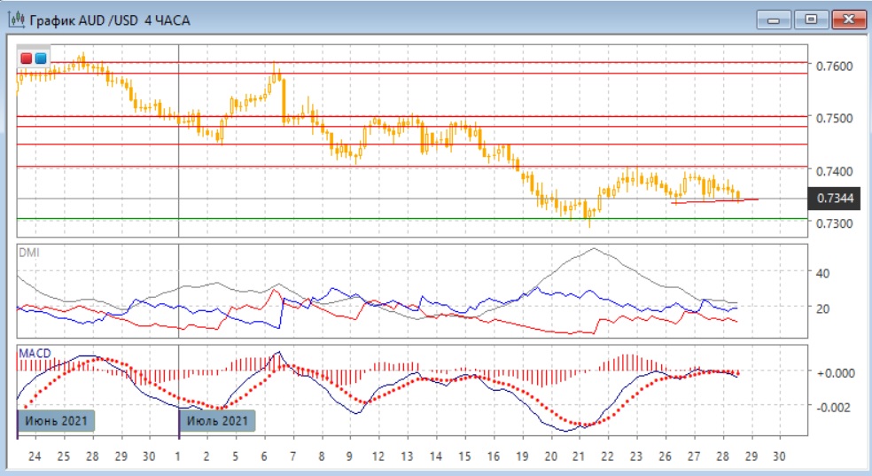 На четырёхчасовом графике пара находится около уровня минимумов 26 и 27 июля у 0,7340. Преодоление этого уровня делает следующей поддержкой только "круглый" уровень 0,7300. Так как максимумы с 22 июля постепенно снижаются, сейчас более вероятно преодоление этой поддержки, учитывая, что происходящее не похоже на разворот вверх от 0,7300.
