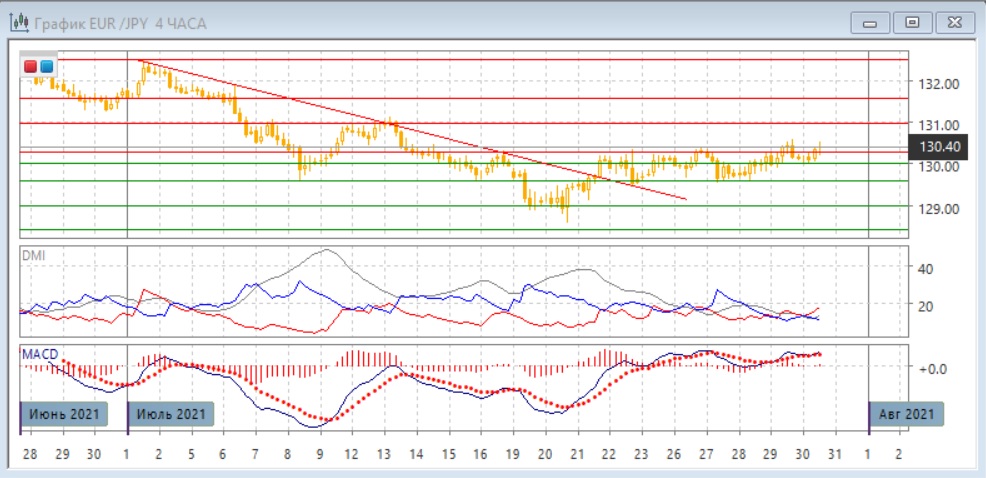 На четырёхчасовом графике пара тестирует верхнюю границу диапазона 129,60-130,30. Так как после возвращения в диапазоне после выхода выше 29 июля пара не снизилась до нижней границы, а снова выросла выше уровня 130,30, шансы на выход вверх увеличиваются. Также предпочтителен выход из диапазона вверх потому. что пара ранее преодолела уровень нисходящего тренда. По индикаторам направленного движения флэт: DM+ и DM- близки, уровень ADX относительно низкий, гистограмма MACD продолжает колебания около нуля.