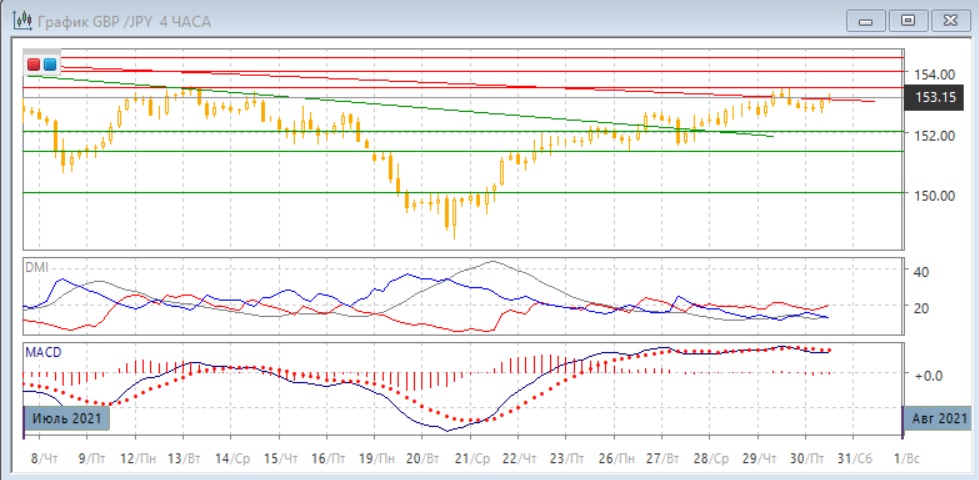 На четырёхчасовом графике рост продолжается (относительные минимумы и относительные максимумы постепенно повышаются). Замедление роста видно по тому, что новые максимумы не подтверждаются по гистограмме MACD. Однако снижение от зоны сопротивления из линии тренда и уровня 153,50 после образования медвежьего расхождения максимумов пары и гистограммы MACD не получило развития. Это может быть бычьим сигналом, так как медвежьи сигналы не сработали. Однако для того, чтобы рассчитывать на дальнейший рост, необходимо закрепление выше зоны сопротивления. До этого вероятность отката велика, так как пара остаётся ниже сильной зоны сопротивления.