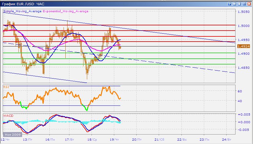 17 ноября, после предпринятой в самом начале торгов попытке тестирования уровня 1.5000, пара резко пошла вниз, практически достигнув уровня 1.4800. последовавшая затем коррекция вверх помогла паре закрыться в пределах 1.4880. Вчера пара продолжала рост, снова предприняв попытку добраться до уровня 1.5000, показав при этом максимум на 1.4993. С начала сегодняшних торгов пара снижается. Средние скользящие ЕМА21 и ЕМА55 направлены вверх, индикаторы MACD и RSI снижаются к своим центральным линиям. Цель пары вниз — тестирование 1.4900, затем движение к 1.4880 (с поддержкой от средней линии) и потом к 1.4860. Движение вверх направлено на 1.4940 (с сопротивлением от ЕМА55), далее к 1.4960 (с сопротивлением от ЕМА21) и далее 1.4980 и 1.5000.