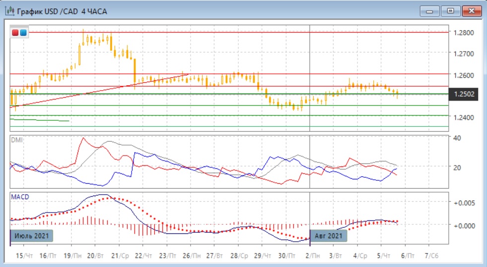 На четырёхчасовом графике пара перешла к снижению после тестирования уровня 1,2540 (нижняя граница консолидации в конце июля). Сейчас пара достигла психологически важного уровня 1,2500, но отсутствие отскока от него вверх скорее является медвежьим сигналом. При преодолении 1,2500 следующей целью является поддержка конца июля - начала августа на 1,2450. По индикаторам направленного движения происходит разворот: DM- сейчас выше DM+, гистограмма MACD перешла в отрицательную зону, линия MACD медленно разворачивается.