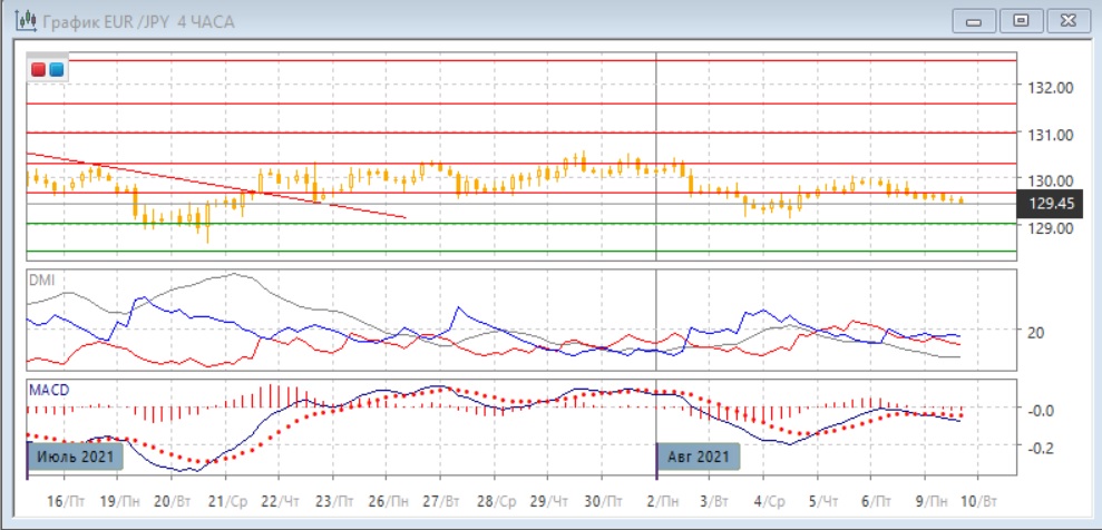 На четырёхчасовом графике пара остаётся в диапазоне 129,00-130,30, центром колебаний является уровень 129,65. В рамках движения в этом диапазоне пара может снизиться после снижения от сопротивления на 130,00 к нижней границе на 129,00. Это также более вероятно из-за закрепления ниже 129,65. Однако в целом пара во флэте и выраженного направления нет. Это видно по индикаторам направленного движения: DM- и DM+ пересекаются, линия ADX на низком уровне, гистограмма MACD колеблется около нуля.