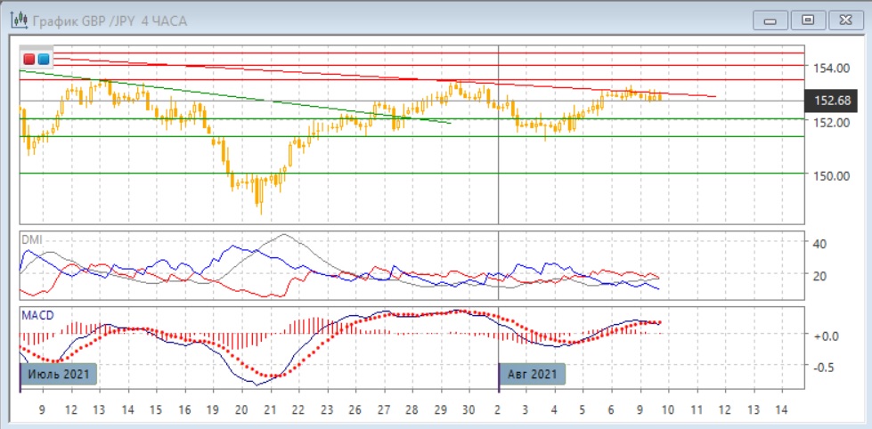 На дневном графике пара находится у нисходящей линии тренда с мая, также она приближалась к сопротивлению на 153,50 (у относительных максимумов июля). Отката от этой зоны не произошло, что может быть бычьим сигналом. Однако и преодоления зоны сопротивления также не произошло, поэтому рассчитывать на рост преждевременно. Более краткосрочные индикаторы направленного движения уже указывают на рост: гистограмма MACD растёт в положительной зоне, линия MACD имеет положительный наклон.