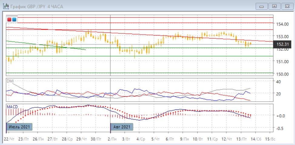 На четырёхчасовом графике снижение от после того, как пара не удержалась выше уровня 153,00 (он выступал поддержкой 10-12 августа), привело к преодолению линии нисходящего тренда и достижению следующего "круглого" уровня 152,00. Хотя пара получила здесь поддержку, уровень не является сильным, и пара остаётся ниже линии тренда. Это сохраняет возможность возобновления снижения в краткосрочной перспективе. Сильная поддержка будет на 151,35. По индикаторам направленного движения тенденция изменилась на снижение: DM- теперь выше DM+ при относительно высоком уровне ADX. Гистограмма MACD находится в отрицательной зоне, линия MACD имеет отрицательный наклон.