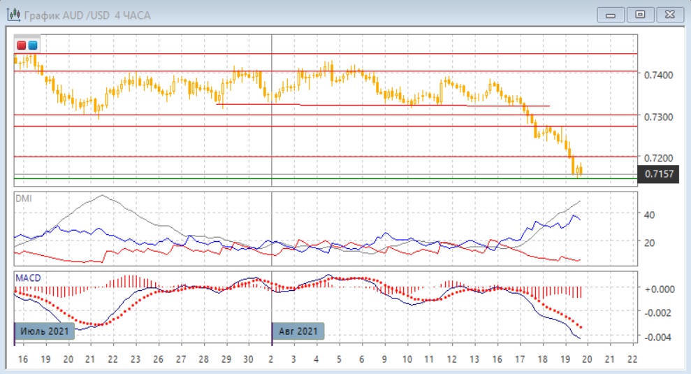 На четырёхчасовом графике происходит отскок от 0,7145, но пока он слабый, и остаётся в пределах небольшой коррекции. До этого образовалось бычье расхождение минимумов пары и гистограммы MACD, потенциально это усиливает вероятность более существенного отскока. Сопротивлением сейчас можно рассматривать ближайший "круглый" уровень 0,7200. Однако тенденция снижения очень сильная, и против неё идти слишком рискованно, даже при назревшей коррекции (примерно на 200 пунктов существенных коррекций не было). По индикаторам направленного движения тенденция снижения сильная: DM- значительно выше DM+, ADX высоком уровне, гистограмма MACD в отрицательной зоне, линия MACD имеет отрицательный наклон.