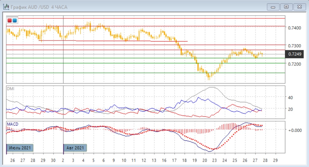На четырёхчасовом графике откат от сопротивления на 0,7270 не получил развития. Пара вернулась близко к этому уровню. Это может быть бычьим сигналом, так как откат от 0,7270 не был похож на начало завершения коррекции к снижению, если рассматривать так волну роста с 20 августа. Тем не менее, ложный пробой уровня 0,7270 может показывать более высокую вероятность выхода из текущей консолидации вниз. Краткосрочно после образования небольшой "падающей звезды" ниже 0,7270 пара, скорее, вернётся к 0,7230 (предыдущего минимума). Более значительное движение скорее будет в сторону выхода из текущей консолидации 0,7230-0,7270.