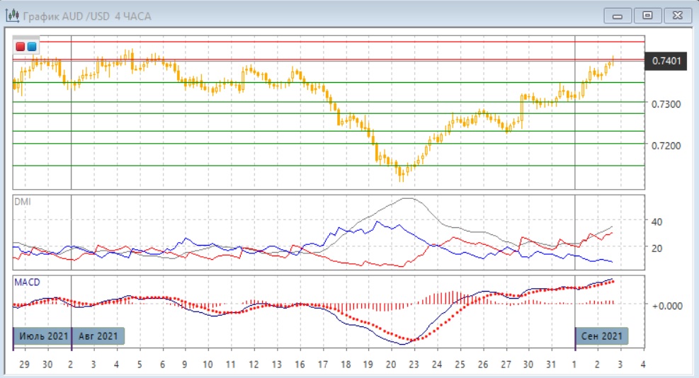 На дневном графике пара преодолела следующий уровень сопротивления 0,7350. Она также закрепилась выше "круглого" уровня 0,7300, который также важен как уровень поддержки с середины июля по середину августа. Сейчас всё снижение августа отыграно, и преодоление следующего "круглого" уровня 0,7400 открывает пространство к дальнейшему росту, так как до 0,7600 сильного сопротивления не видно. По индикаторам направленного движения тенденция роста усиливается: превышения DM+ над DM- увеличивается, гистограмма MADC растёт в положительной зоне, линия MACD имеет положительный наклон.