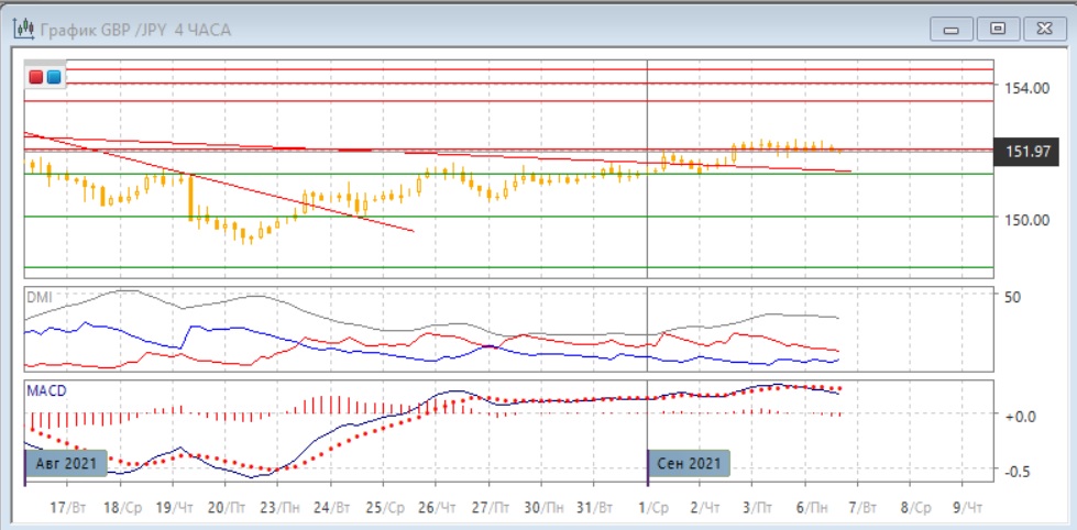 На четырёхчасовом графике рост замедлился, пара со 2 сентября находится у уровня сопротивления 152,00, при этом образуются близкие к "дожи" свечи. Последовательность роста с 20 августе на не нарушена - относительные минимумы продолжают расти. По ADX тенденцией также остаётся рост: превышение DM+ над DM- сохраняется. Пара закрепилась выше тренда дневного масштаба. При коррекции сильная поддержка может ожидаться на уровне 151,30 и линии тренда - они почти совпадают на данный момент. Дальнейшее движение в краткосрочной перспективе, вероятно, будет в сторону отхода от 152,00.