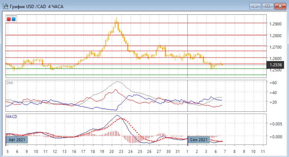 На дневном графике пара достигла психологически важного уровня поддержки 1,2500. С точки зрения тенденции важно, что пара преодолела на 1,2600, которая тестировалась с конца августа. Тенденция снижения сохраняется, и более вероятно, что и уровень 1,2500 также будет преодолён. По ADX назревает смена тенденции: превышения DM+ над DM- уже нет. По более краткосрочным индикаторам тенденцией является снижение: гистограмма MACD снижается в отрицательной зоне, линия MACD имеет отрицательный наклон. Ближайшей целью снижения сейчас видится уровень 1,2450 - у максимумов июня и поддержка в июле.