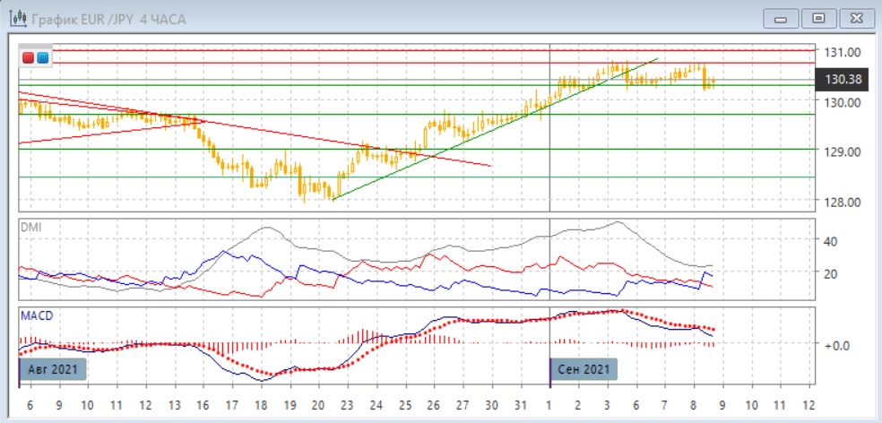 На четырёхчасовом графике видно, что пара остаётся выше уровня поддержки 130,30 - 8 сентября она снова восстановилась при кратковременно преодолении уровня. Если предполагать движение в диапазоне с начала сентября, целью может быть уровень 130,70 - у предыдущих максимумов. Если рассматривать снижение ниже 130,30 в среду как "ложный пробой", то вероятность движения к 130,70 увеличивается. Однако предположение о консолидации перед дальнейшим ростом справедливо, пока пара не вышла из диапазона 130,30-130,70 вниз.