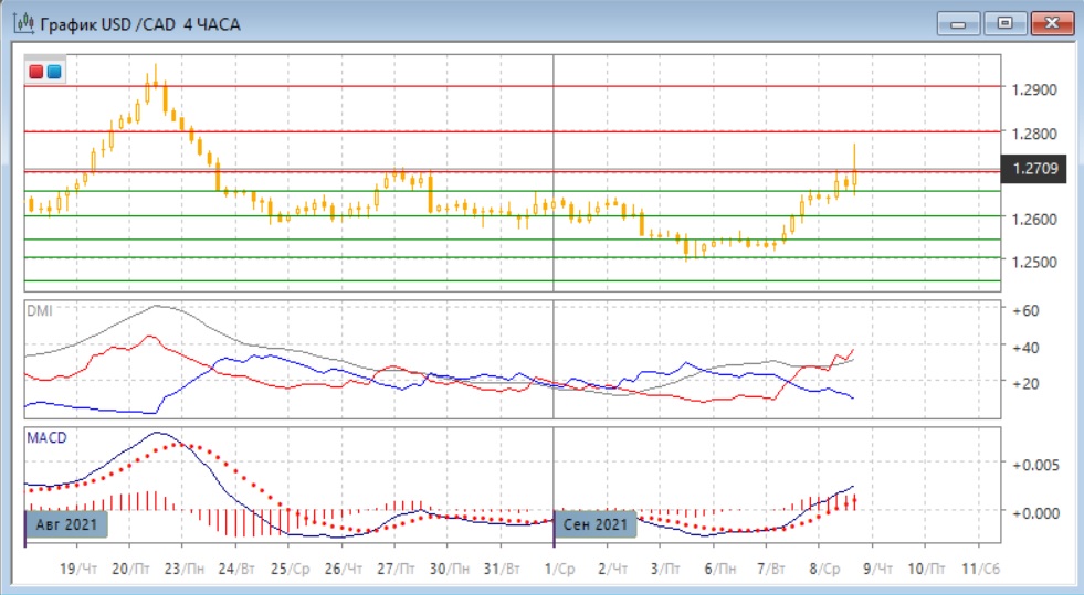 На четырёхчасовом графике большая верхняя тень выше 1,2700 может быть сигналом того, что волна роста от 1,2500 достигла кульминации - преодоление ещё одного "круглого" уровня 1,2700 не было поддержано. Однако тенденция в этом масштабе изменилась: последовательность снижения относительных максимумов пары нарушена, пара преодолела ключевое сопротивление на 1,2600 (поддержка в конце августа и в начале сентября). При откате ближайшая поддержка может быть на 1,2655 (что совпадает к минимумов текущей свечи), и далее на "круглом" уровне 1,2600.