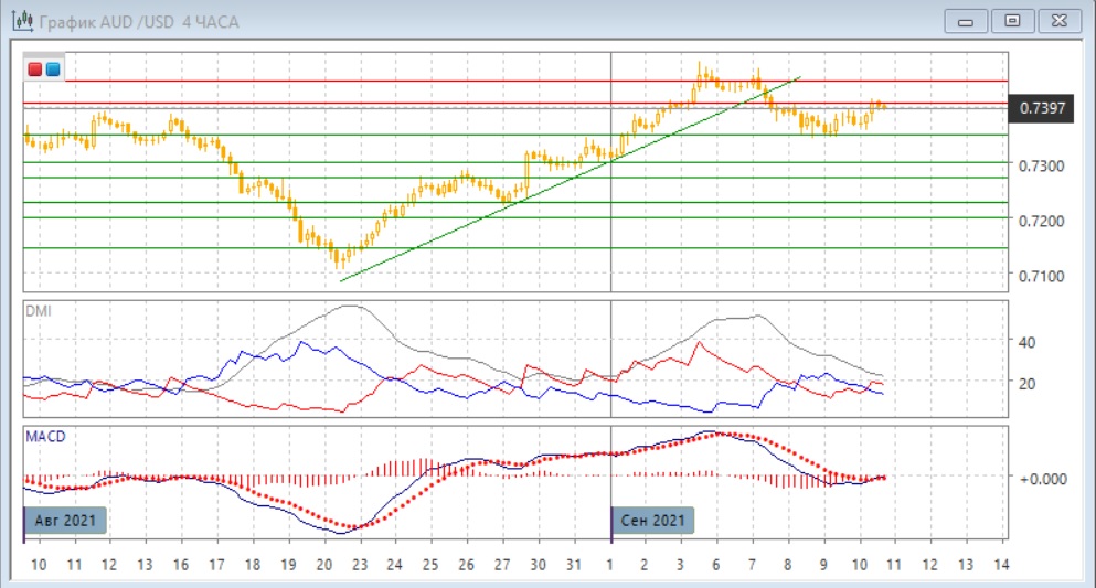 На четырёхчасовом графике, снижение, возможно остановилось. Относительные максимумы и минимумы теперь растут. Около поддержки на 0,7350 образовалось три минимума, что укрепляет её. По длительности волна роста от 0,7350 примерно равна волне снижения 7-8 сентября, что делает рост более длительным, чем нормально для коррекции к снижению. Закрепление выше 0,7400, вероятно, обозначило бы возобновление роста.